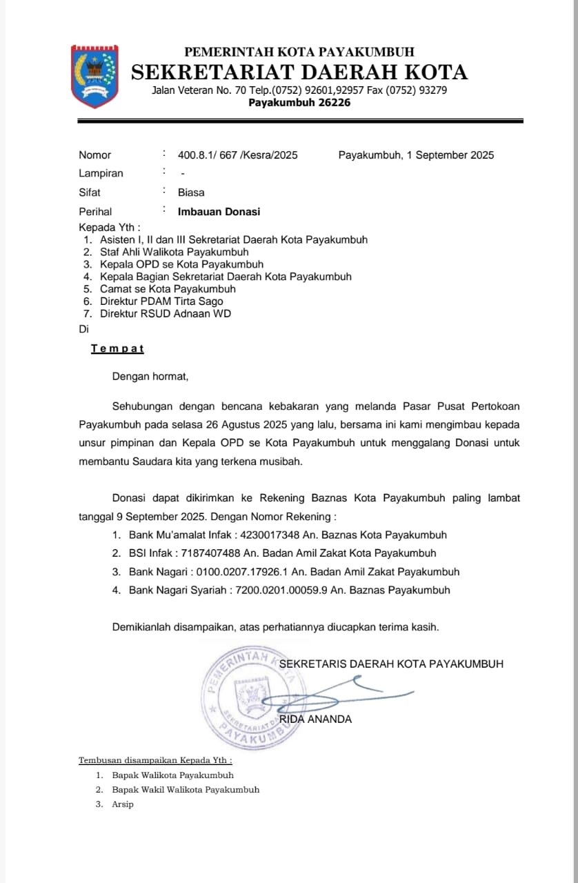 Hal ini sesuai dengan himbauan donasi pada 1 September lalu, No 400.8.1/667/kesra/2025 yang ditujukan kepada OPD se Kota Payakumbuh.(TimBW)