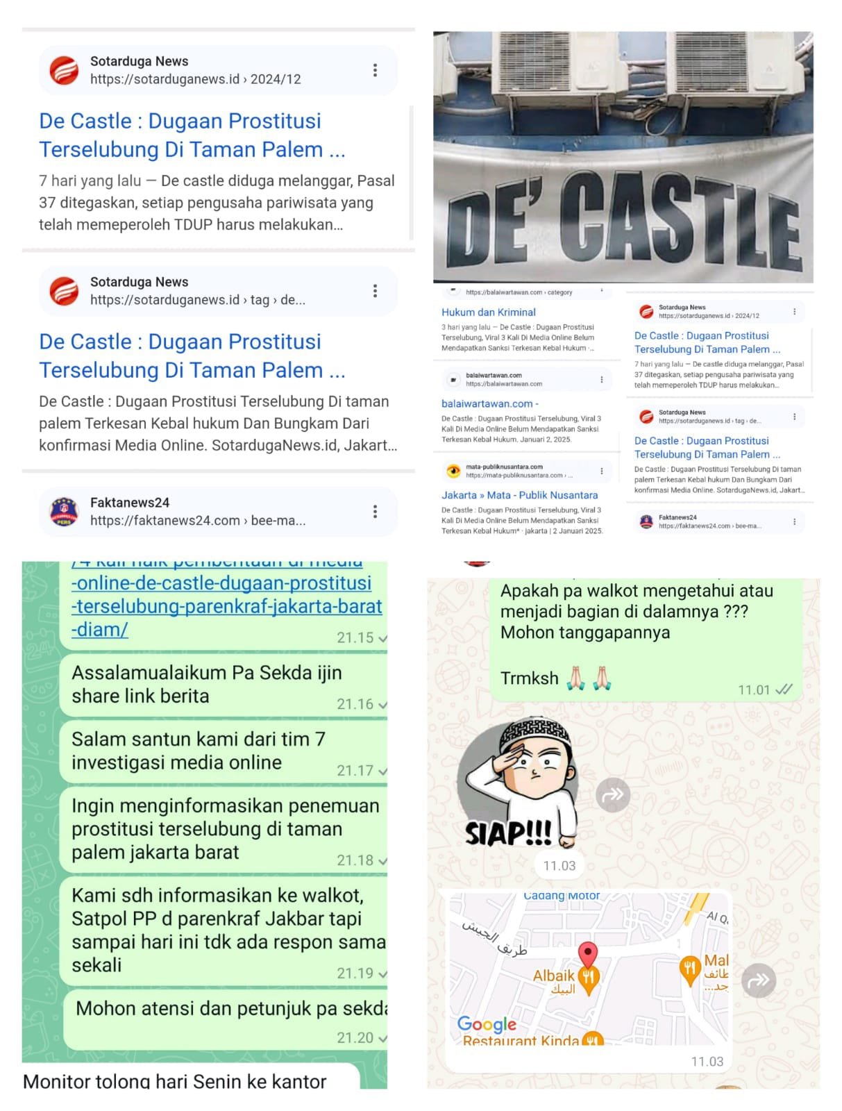 Pemberitaan sudah 4 kali di media online dan viral serta sudah di laporkan ke parenkraf juga satpol PP hasilnya hanya Diam seribu bahasa tanpa ada croscek ke lokasi sampai dengan Senin 13 Januari 2024, padahal dugaan praktek prostitusi terselubung de castle sangat jelas dan nyata meresahkan warga masyarakat yang tinggal di sekitarnya. De Castle terletak di ruko mutiara taman palem blok A20 no 9 Kel Cengkareng timur kec Cengkareng Jakarta Barat.