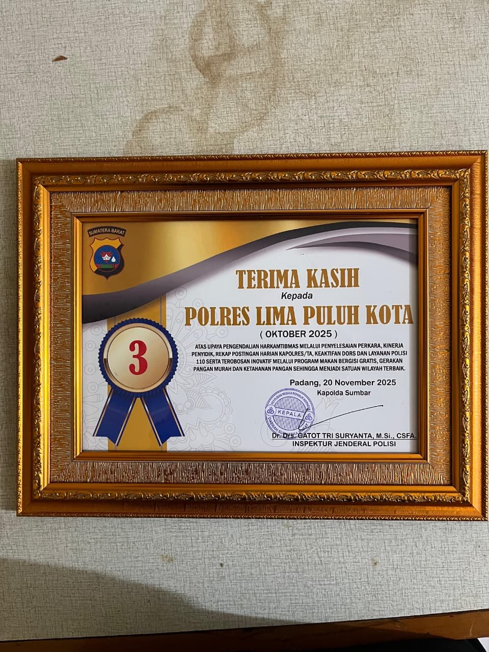 Penghargaan tersebut diserahkan langsung oleh Kapolda Sumatera Barat, Dr. Drs. Gatot Tri Suryanta, M.Si., CSFA, Inspektur Jenderal Polisi, di Padang pada Kamis, 20 November 2025.