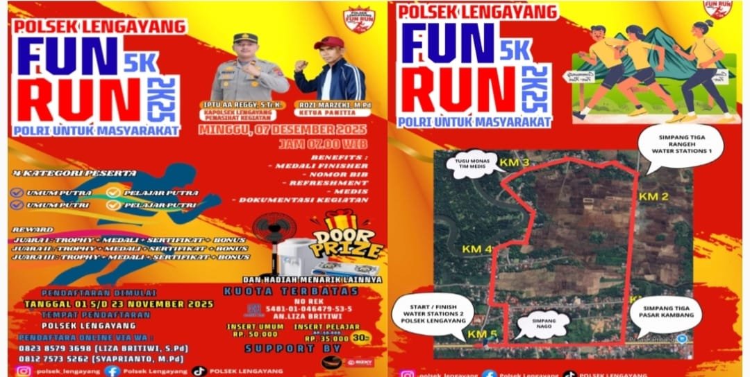 Pendaftaran peserta Fun Run 5K 2K25 dapat dilakukan langsung di Polsek Lengayang hingga tanggal 23 November 2025. Kuota peserta terbatas. Segera daftarkan diri Anda, rasakan semangat kebersamaan bersama Polri, dan jadilah bagian dari momen bersejarah ini. TIM