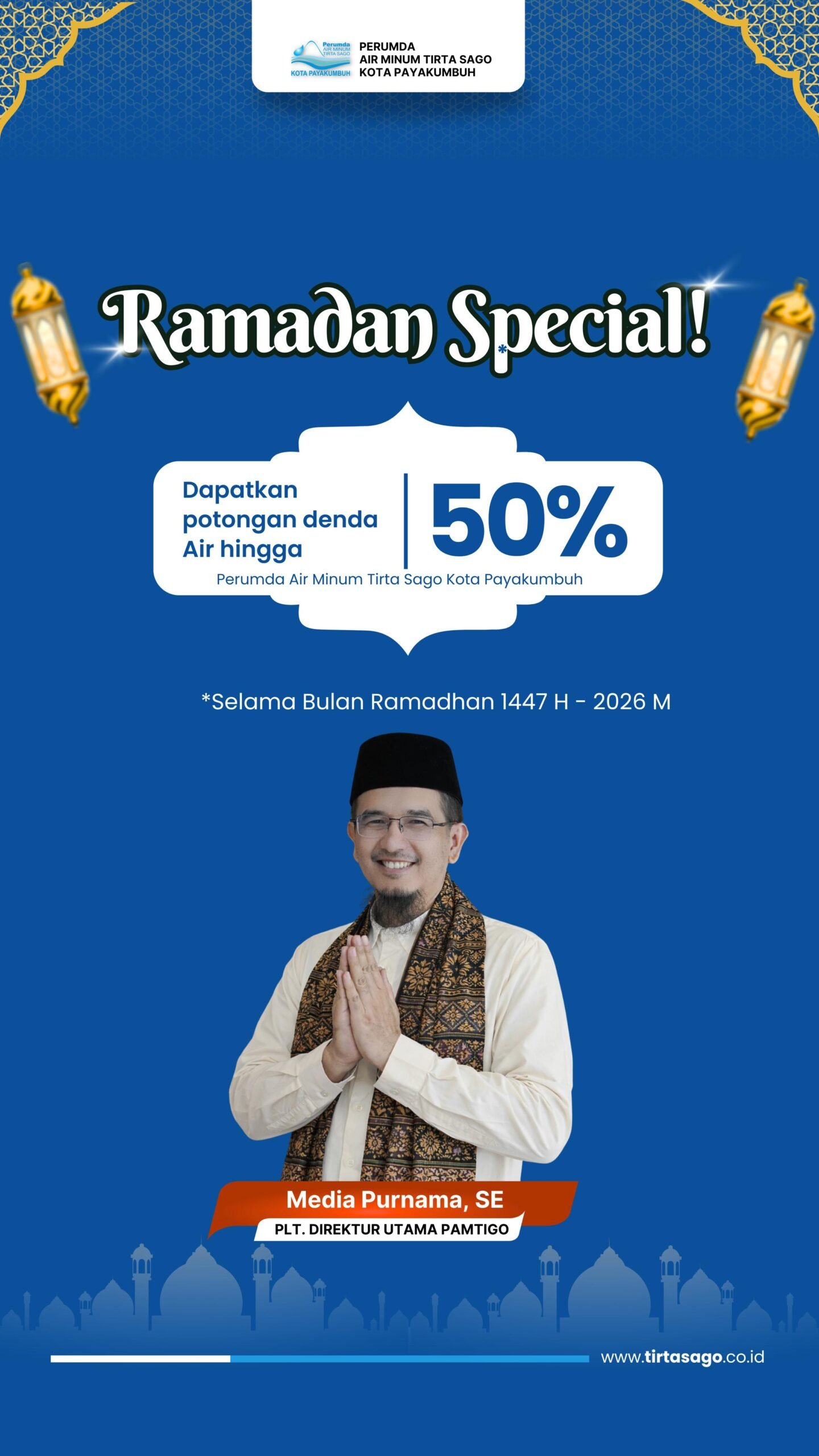 Payakumbuh, Balaiwartawan.com – Dalam rangka menyambut bulan suci Ramadhan 1447 H/2026 M, Perusahaan Umum Daerah (Perumda) Air Minum Tirta Sago Kota Payakumbuh menghadirkan program “Ramadhan Special” yang memberikan keringanan bagi pelanggan berupa diskon keterlambatan denda air 50%. Program ini bertujuan untuk membantu meringankan beban masyarakat dalam memenuhi kebutuhan air bersih selama bulan suci Ramadhan, sekaligus meningkatkan kesadaran akan pentingnya membayar tagihan air tepat waktu.